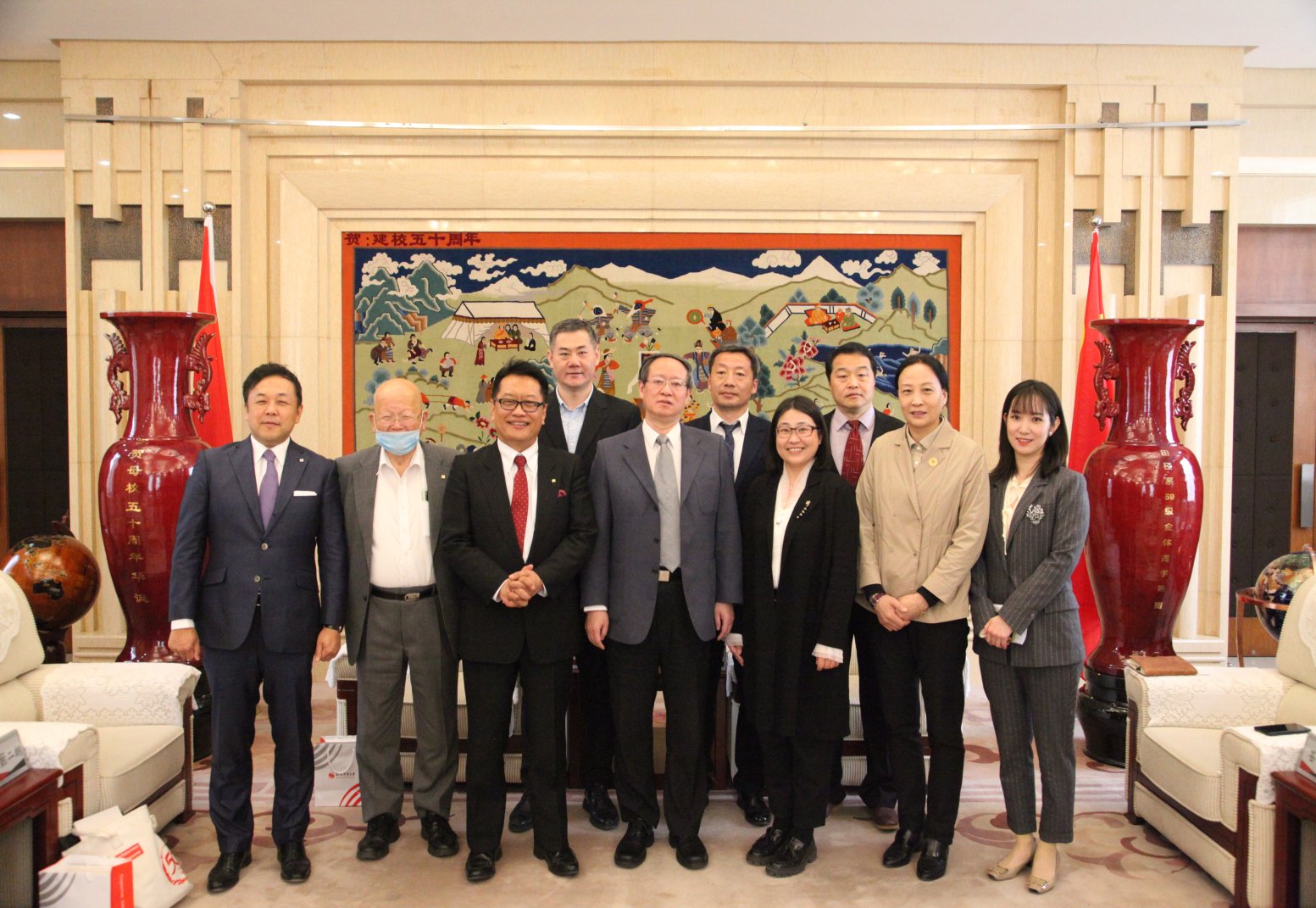 4月13日上午,日本中国友好协会代理理事长揚原安麿一行7人来我校交流访问,党委副书记、常务副校长高峰会见代表团。