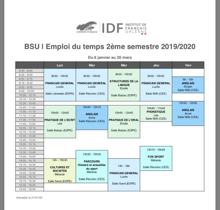 奥尔良大学的课程安排较为紧凑,有助于学生高强度、高频率地学习语言。在授课老师配置方面,每个学期每门科目的授课老师都有所变化或调整,不同的老师有不一样的授课方式和风格,使得无法变化的科目主题具有了一些新鲜感。课程内容设置全面而丰富,不仅包括法语听说读写的综合能力训练,还涉及法国文化和体育项目的知识普及。除此以外,奥大对于北体学生还开设了体育法语、法国体育历史等与时事、体育相结合的特色科目。这些专业词汇通常在法语课本上是见不到的,使学生受益匪浅。另外,法国人本身热爱体育和锻炼,体育相关词汇的扩充也为学生们和法国同学的日常交流增添了话题。