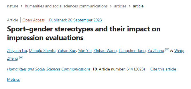 2023年9月26日,我校心理学院2020级本科生刘志远及其课题小组在该院张禹和郑玮琦老师的指导下,在国际顶级期刊《自然》(Nature) 的旗下期刊《人文与社会科学通讯》(Humanities & Social Sciences Communications) 发表了题为“运动-性别刻板印象及其对印象评价的影响”(Sport–gender stereotypes and their impact on impression evaluations)的研究论文。《Humanities & Social Sciences Communications》是Nature旗下唯一的人文社科综合类刊物,同时被A&HCI与SSCI收录,位列SSCI的Q1区序列。该刊致力于出版人文与社会科学所有领域的高水平研究,在国内外的人文社科领域具有重要影响力。