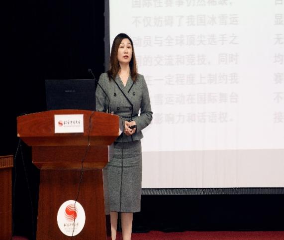 王飞教授以《激活冰雪经济活力:赛事赋能与对外交流新方略》为题发表了主题报告。她深度解读了近期关于冰雪运动高质量发展的顶层政策布局,系统分析当下激活冰雪经济的难点、堵点与痛点,并提出了加快发展冰雪体育赛事和继续深化冰雪经济对外交流合作两条纾解方略。