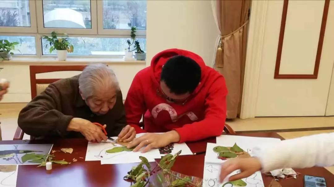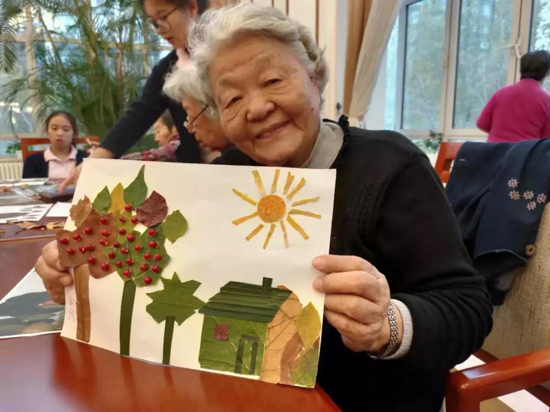 在爷爷奶奶和志愿者的共同努力下,一幅幅精美的贴画很快就完成了。 最让志愿者难忘的,是在做贴画过程中与老人们的交谈,他们毫不保留的表达了自己对志愿者的夸赞和感谢,志愿者与老人共同剪下来的各种形状的树叶,不仅是在画纸上拼凑出了各式各样的图形,也在志愿者的心中拼凑出一份安详宁静的幸福!