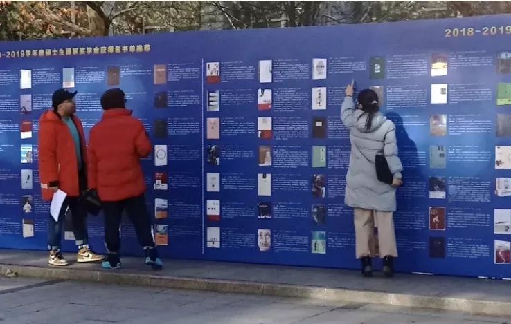 教学楼北侧展出了国家奖学金获得者简介、学习习惯调研报告及他们推荐的书单。