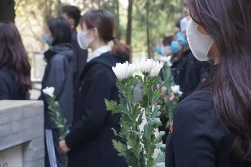 接着,由学生代表敬献花篮、全体师生依次献花。