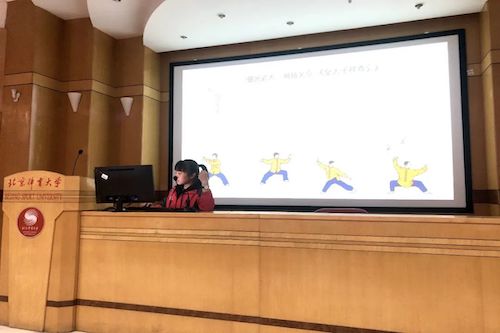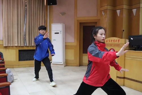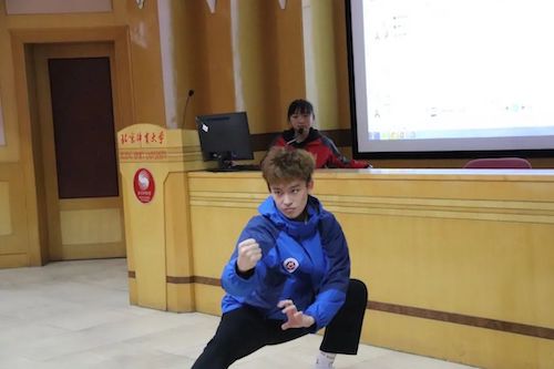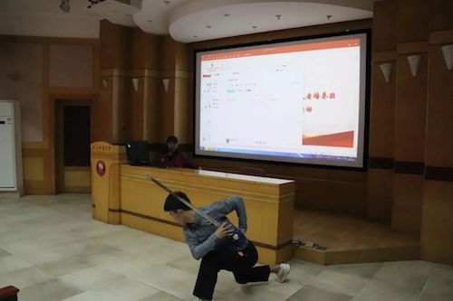 理论学习第一部分,第四期青马班助管,中国武术学院2018级本科生邵银霜做了武术推广宣讲。她从武术解释、武术简史、武术在以后的新发展新机遇三方面向同学们讲授了武术相关知识,并提出了对于传统武术和现代结合的期望。随后,武术学院的同学带来了一段精彩的武术表演。