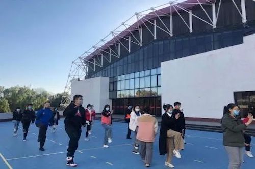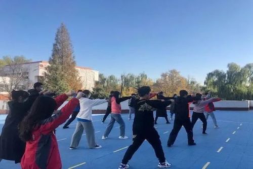 11月8日下午,体育课程教学活动武术培训在体育馆二层进行,中国武术学院2019级本科生黄琦、吴俣带领同学们继续进行二十四式太极拳的学习。