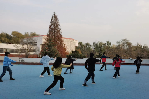 11月15日下午,体育课程教学活动武术培训在体育馆二层进行,中国武术学院2019级本科生黄琦、吴俣带领同学们继续进行二十四式太极拳的学习。